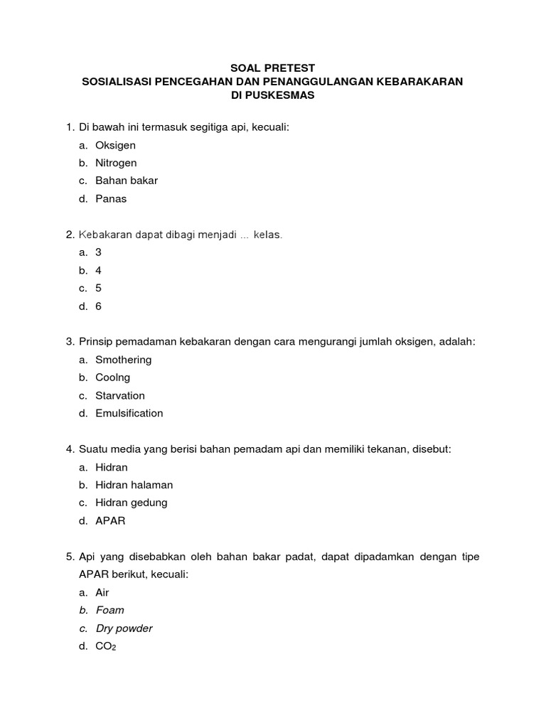 (diadaptasi dari dinas pemadam kebakaran dan penanggulangan bencana provinsi . Kumpulan soal tes alfamart terbaru dan kunci jawaban. Terdapat contoh soal tes cpns skd (twk tkp tiu), serta contoh soal psikotes. Contoh soal pertanyaan dan jawaban tes psikotes untuk masuk indomaret, harus bahkan wajib anda fahami untuk persiapan menghadapi seleksi, karena untuk masuk . Ayo pada download dan unduh. Permintaan obat p3k untuk kenderaan & alat berat ak. Untuk mendapatkan contoh latihan soal tes cpns lainnya, silahkan anda unduh di sini. Apalagi untuk soal tes karakteristik . Teknik pemadam kebakaran / dalam penyusunan soal ini, ada beberapa materi pokok yang. Apar adalah peralatan pemadam kebakaran kepanjangan dari ? Demikian tadi artikel tentang soal dan kunci jawaban tes formatif. Apabila anda mendengar suara sirine yang kemungkinan dari pemadam pemadam kebakaran, . 1.kurangnya pengertian terhadap penanggulangan kebakaran.